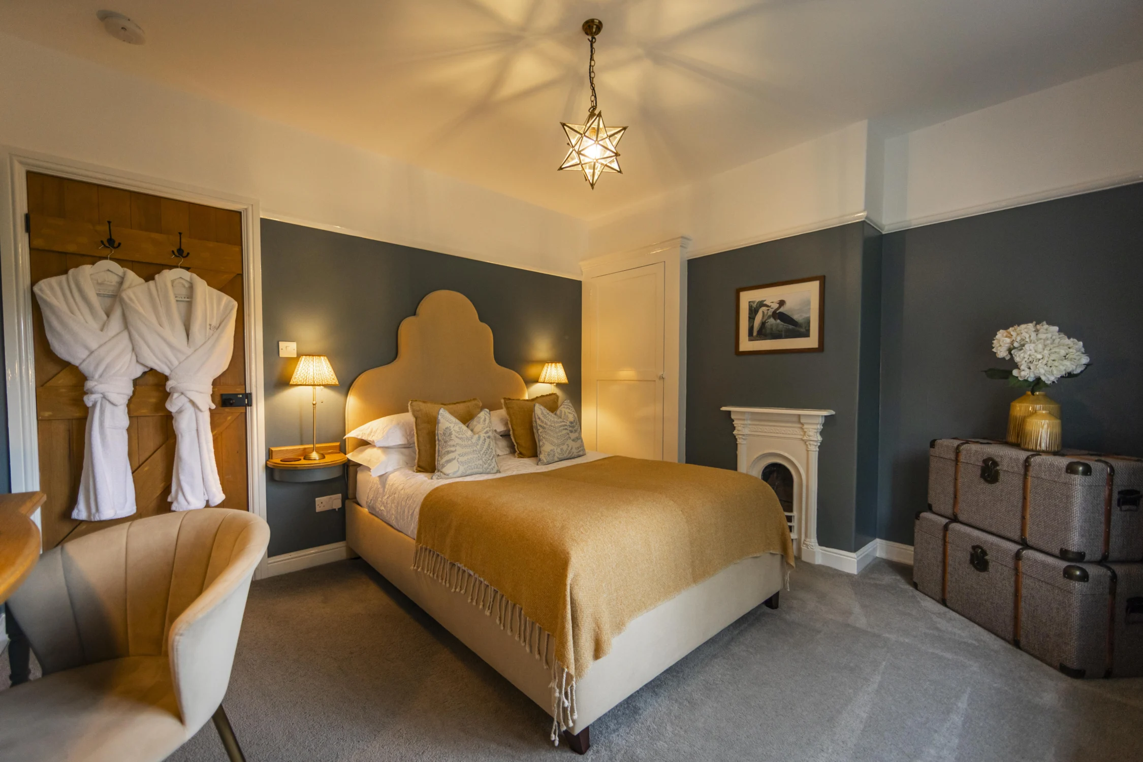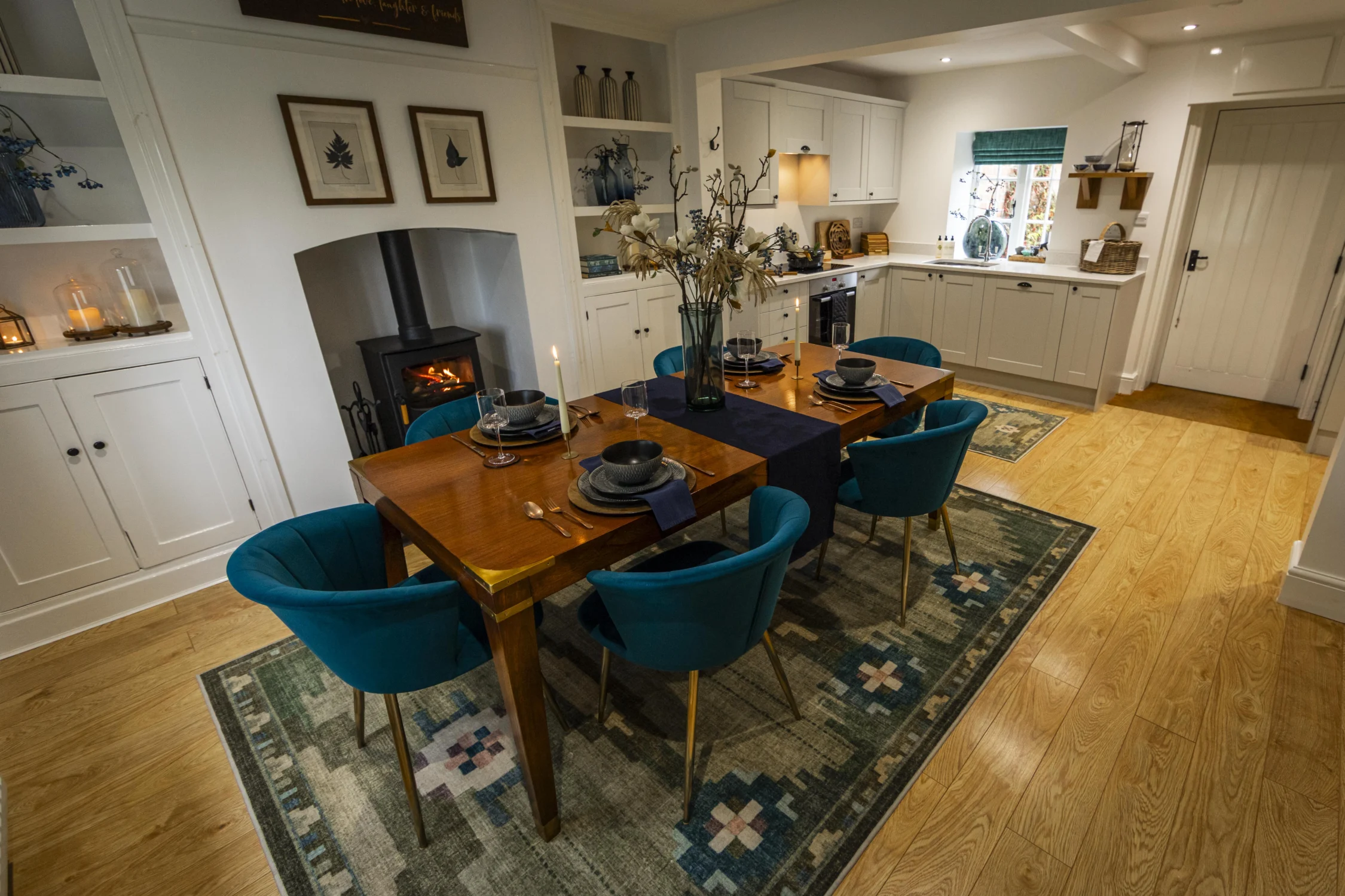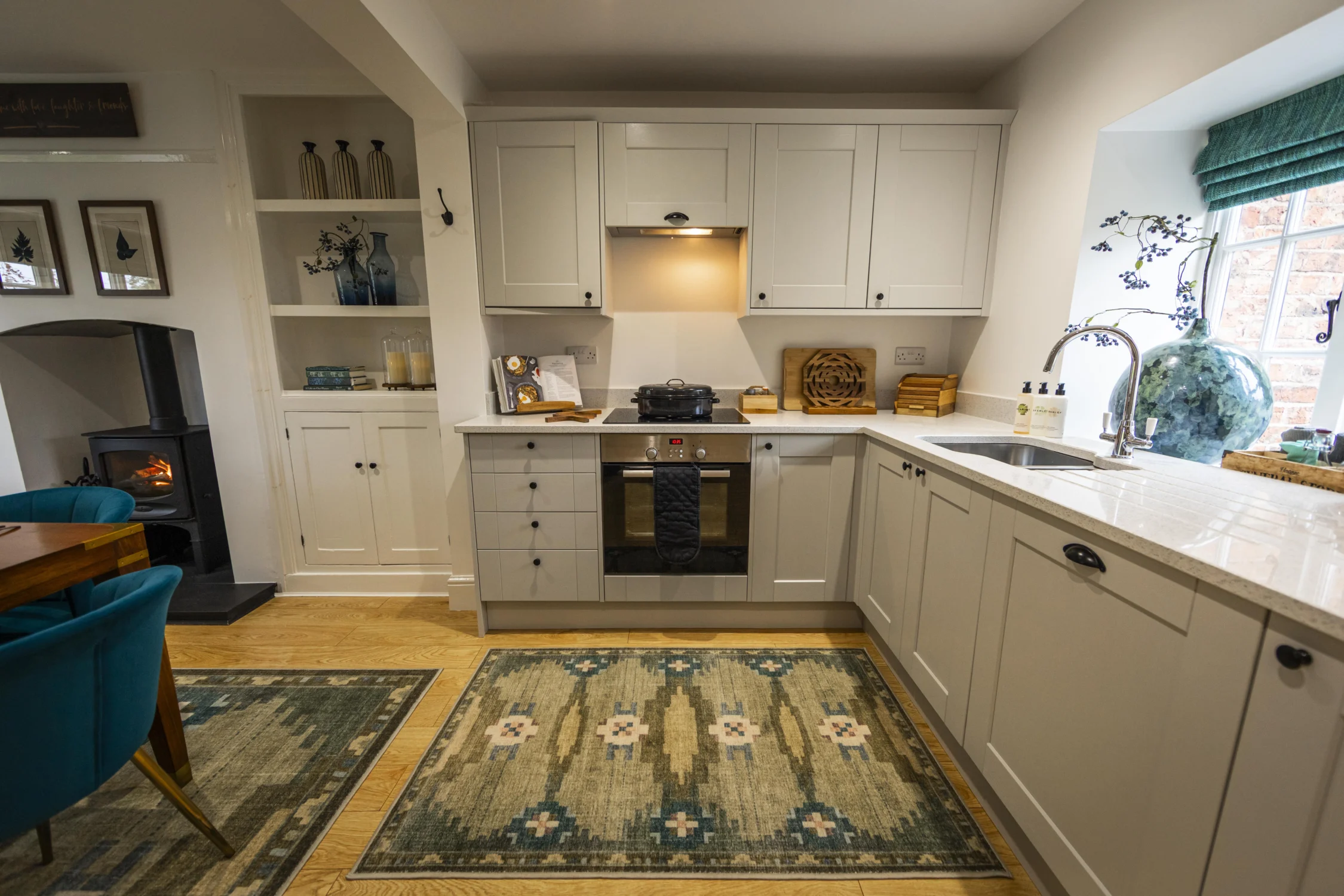The striking Heron Mural on the feature wall in the open-plan kitchen/dining area is undoubtedly the hallmark feature of Heron Cottage. It has three beautifully decorated bedrooms and a cosy living area with a traditional log-burning stove. A truly charming space where guests can relax and feel at home.