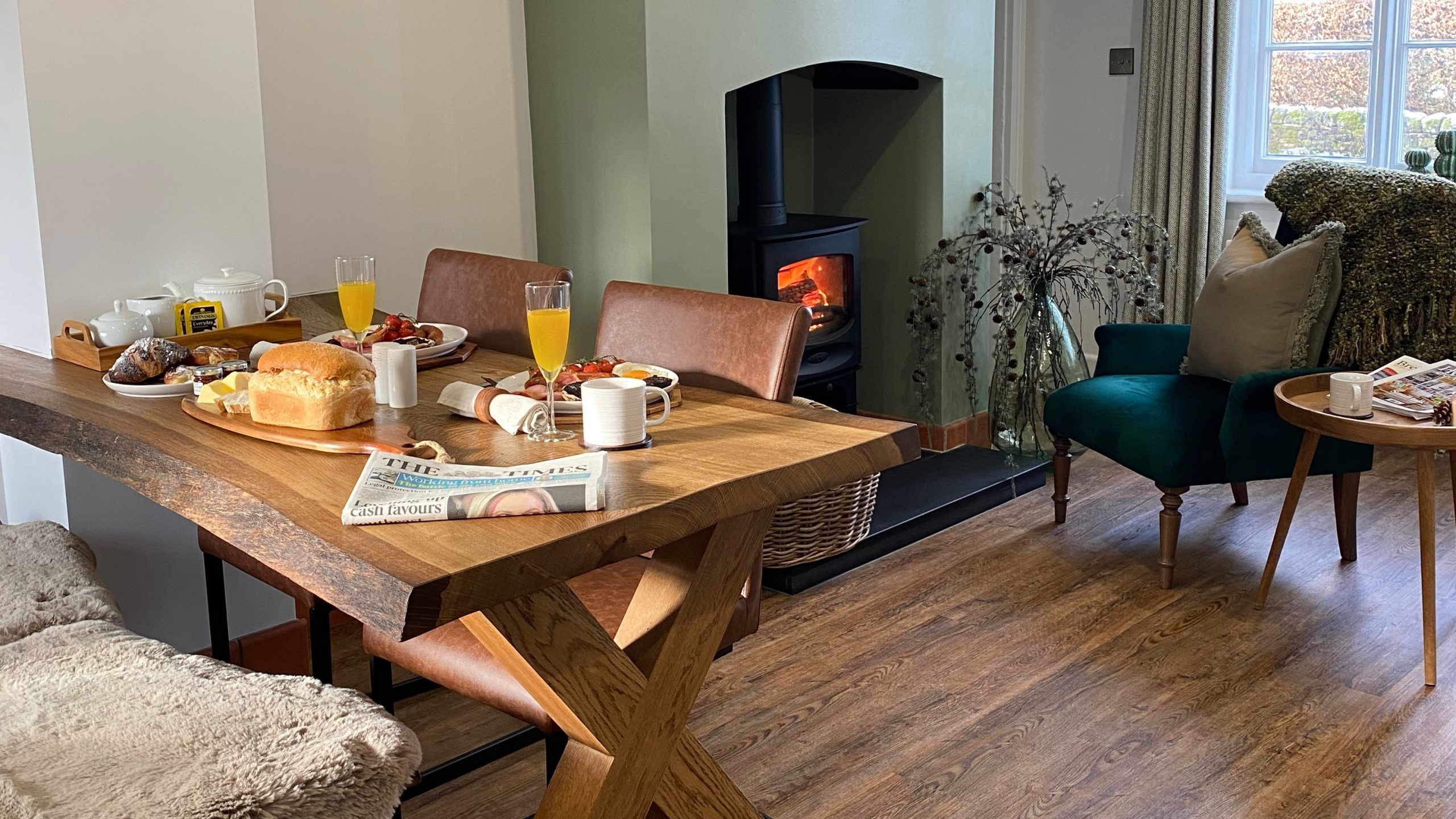 This spacious cottage boasts an open-plan fully equipped kitchen and dining area graced with a bespoke table crafted from a fallen oak tree. Separate from the kitchen and dining area, you will find a cosy living room featuring a leather Chesterfield sofa and two comfortable armchairs, where you can enjoy an evening of tranquillity with the warmth of a wood-burning fireplace.