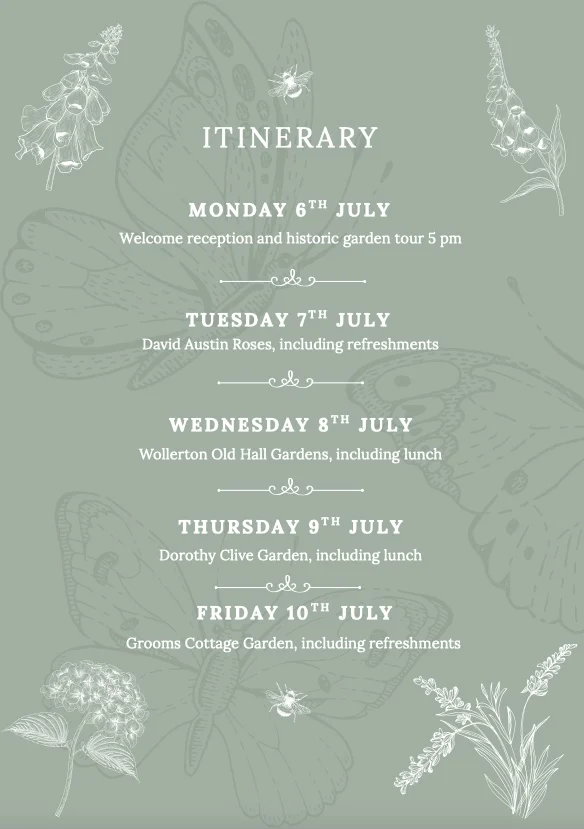 Enjoy a carefully curated blend of inspiring garden visits, charming tea rooms, and relaxed days in the countryside. From the renowned David Austin Roses to the elegant Wollerton Old Hall and Dorothy Clive Garden, each day offers something special, paired with lunch or refreshments along the way.